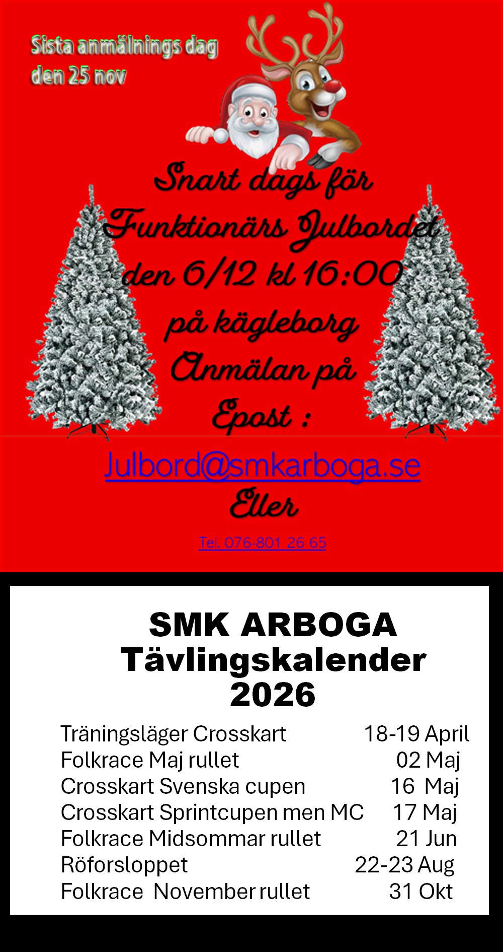 Vi på SMK Arboga vill tacka alla funktionärer som var med och arbetade på tävligen den 1 maj, utan er ingen tävling. Tur med vädret hade vi också. Hoppas vi ses den 23 juni på midsommarrullet. Återigen stort tack till alla som var med och arbetade under tävligen den 1 maj!!
