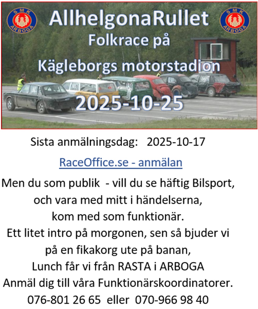 Folkracetävlingen som skulle köras på Kägleborgs Motorstadion den 1 november är flyttad till den 25 oktober istället.